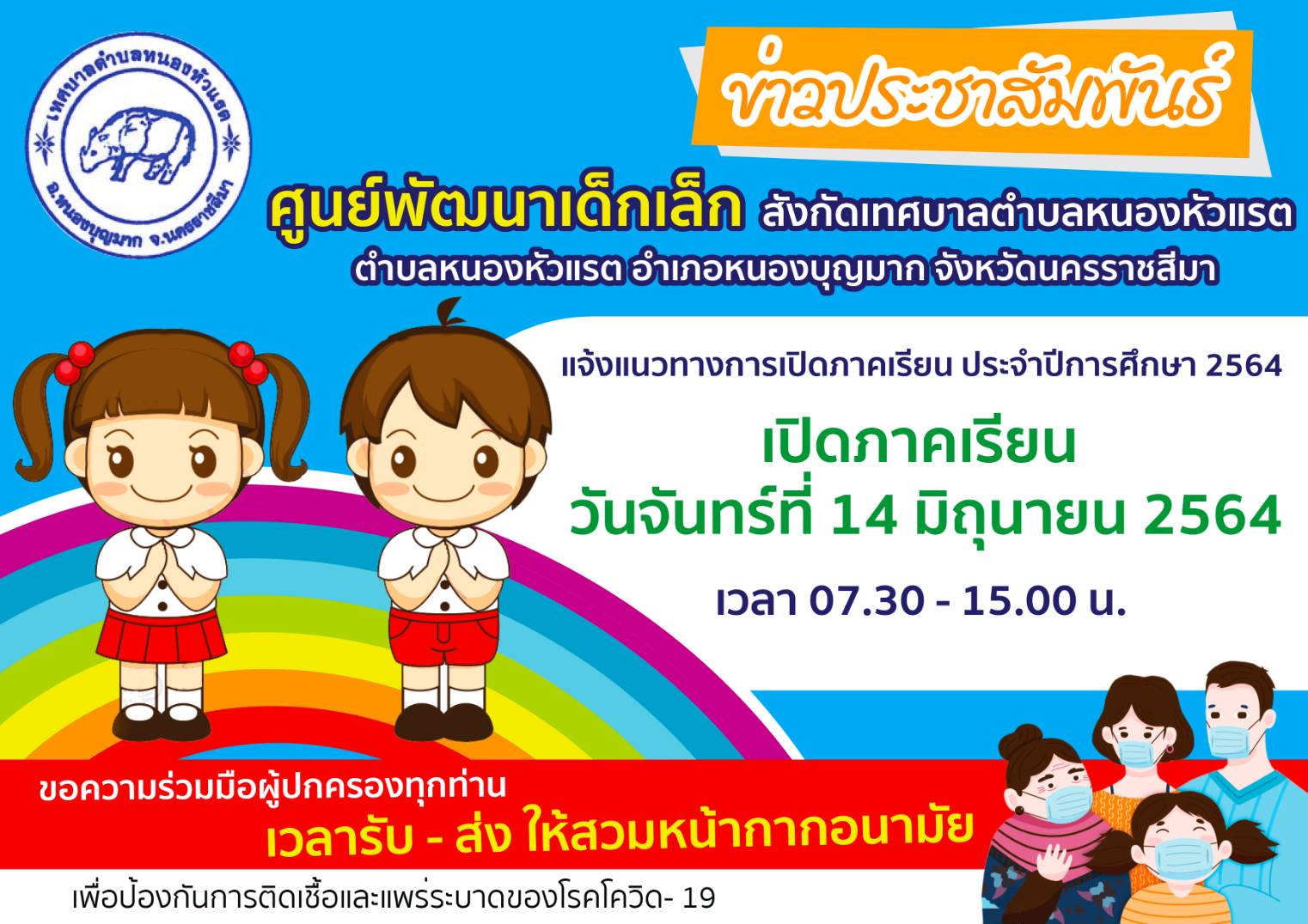 ประชาสัมพันธ์การเปิดเรียนของ ศูนย์พัฒนาเด็กเล็กสังกัดเทศบาลตำบลหนองหัวแรต ประจำภาคเรียนที่ 1 ปีการศึกษา 2564